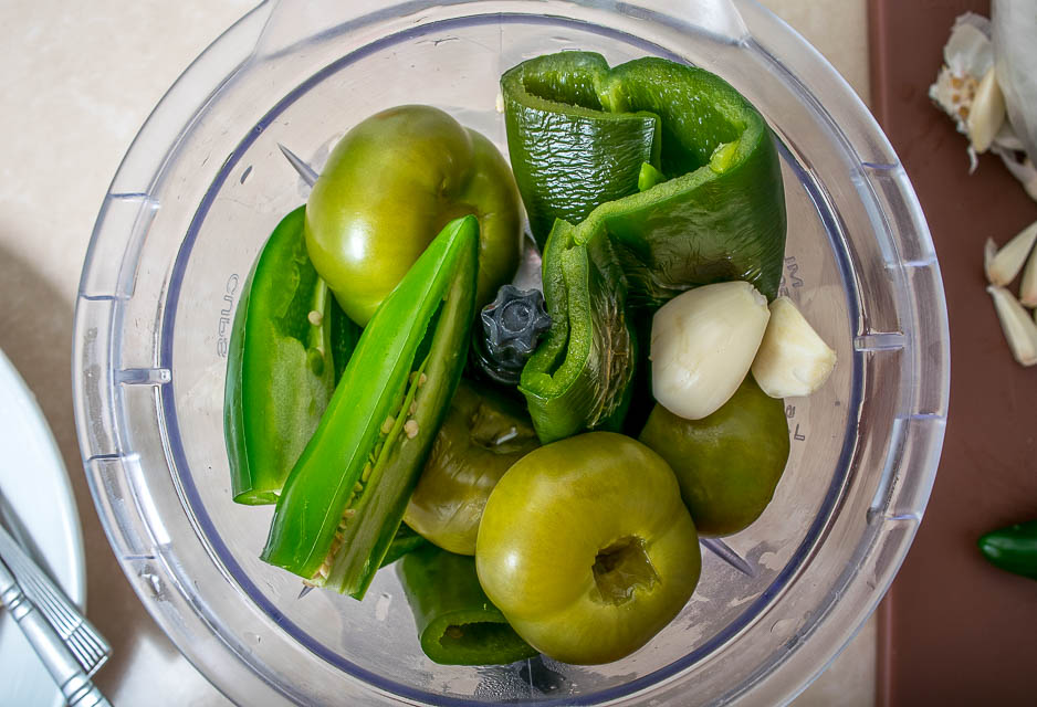 We’ll combine the roasted poblanos and tomatillos in a blender along with: