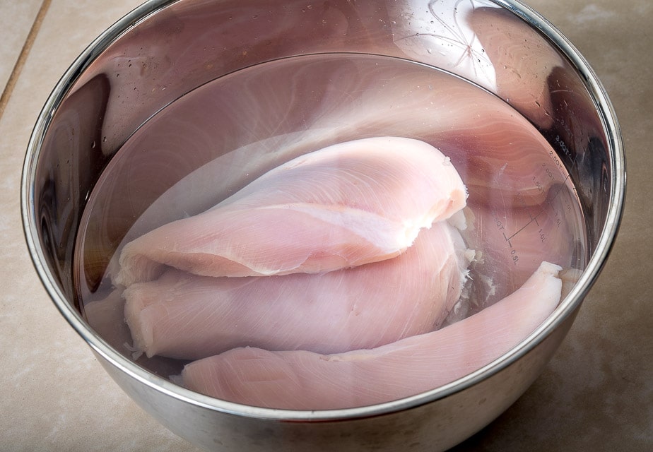 Even a quick brine adds quite a bit of flavor to plain ol’ chicken, so in the above pic that’s 2 lbs. of chicken (3 chicken breasts) brining in 2 quarts of water with 1/2 cup salt dissolved into the water.