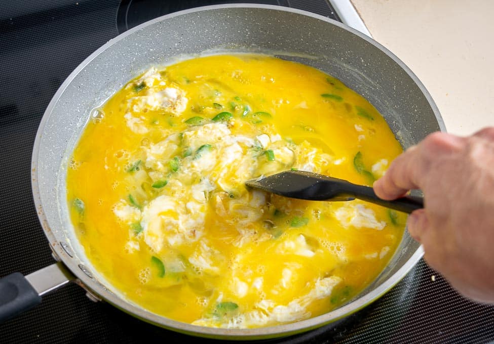 Once the onion has softened you can add 8 whisked eggs — that’ll be plenty for 4 loaded burritos.