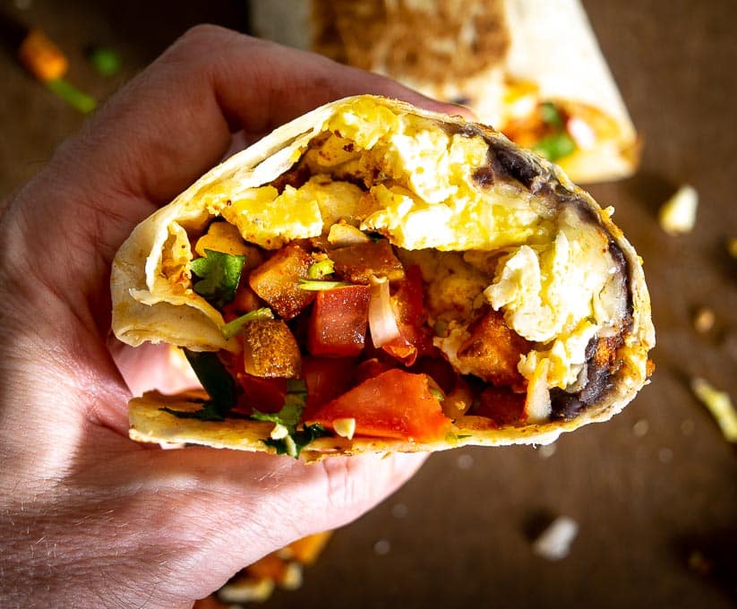 These Vegetarian Breakfast Burritos are the latest binge and I hope you try them out! Loading a breakfast burrito with freshly chopped Pico de Gallo is a real treat and that’s the key to these morning delights.