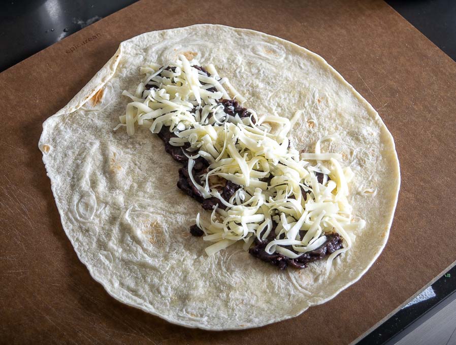 Get a burrito-sized skillet warming up over medium heat. I usually plop the flour tortilla in the skillet for few seconds to wake it up — this makes it easier to roll.
