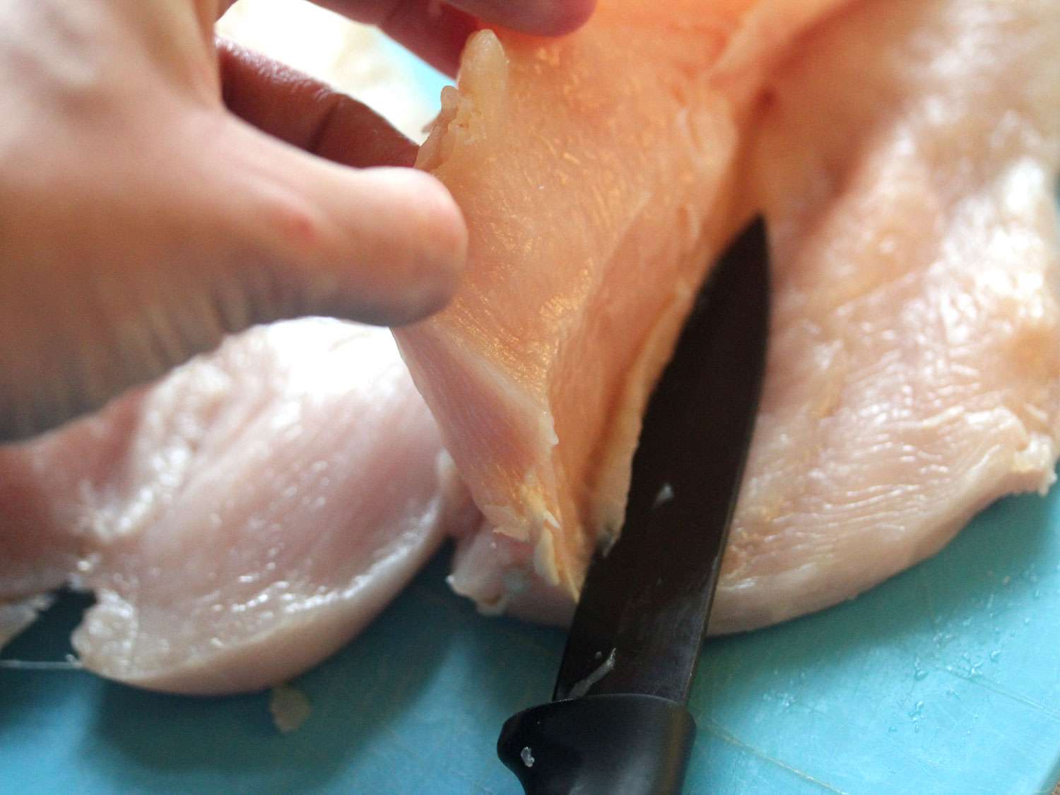 - Pounding the chicken breast halves and trimming them into an even rectangular shape makes stuffing and rolling easier.