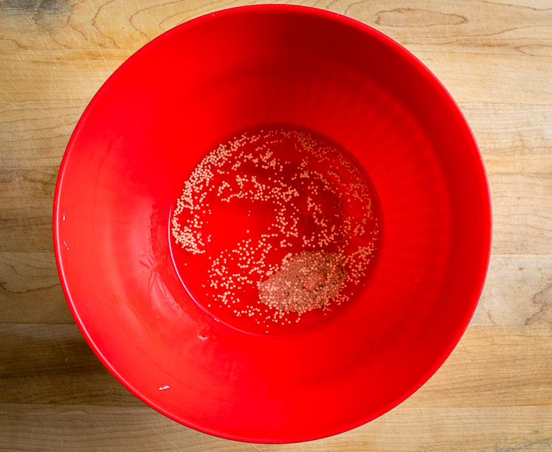 For the dough I’m using a simple recipe from the kitchn but with slightly less salt.   Start by adding 1 teaspoon of yeast to 3/4 cup of warm water.