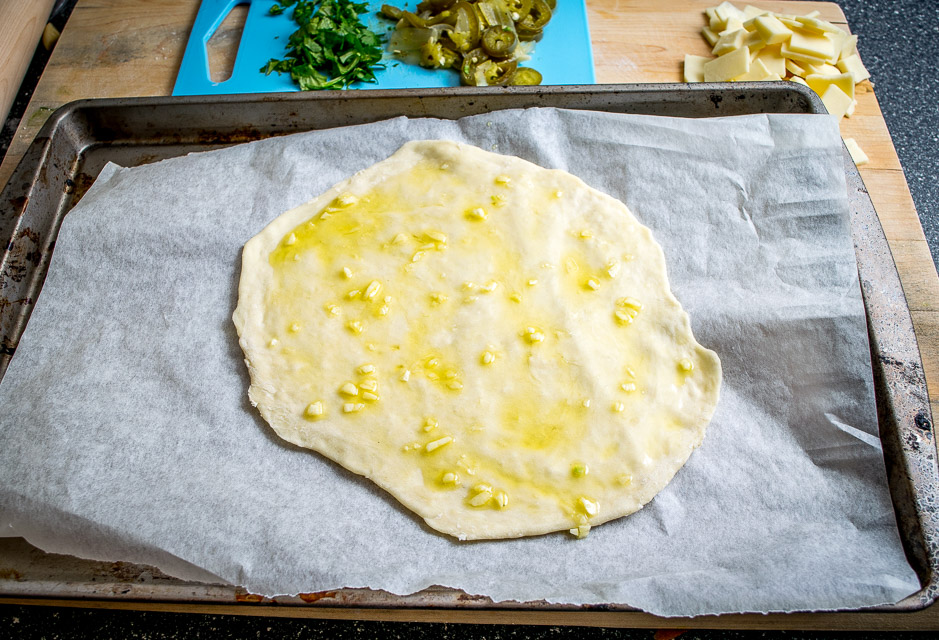 So we are adding the garlic-oil after the dough has already baked for 1-2 minutes at 400F, as pictured above.
