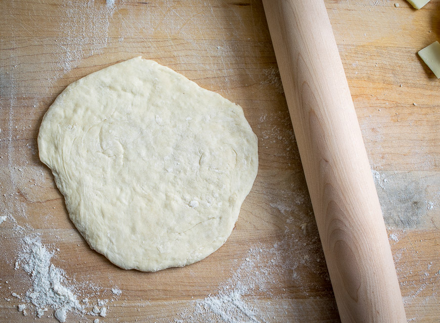For the second pass consider rolling it out on parchment paper, then you don’t have to worry about it sticking to your work surface and it can be cooked directly on the parchment paper.