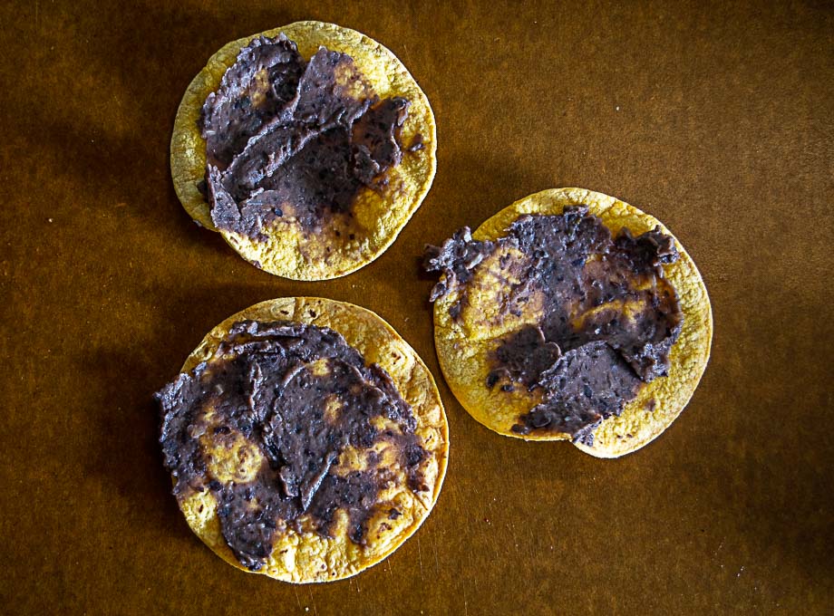 For the tostadas I started with a thin layer of these refried beans. I always seem to have some of those in the fridge but you can consider them optional.