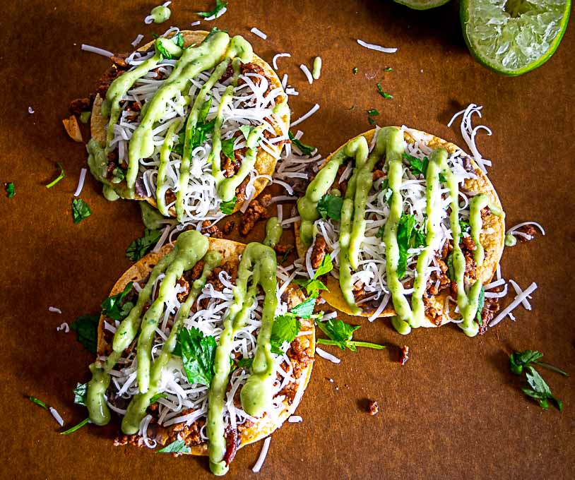 It’ll taste mild out of the blender, but it really comes alive when paired with bold, spicy meats, and that’s the key to these Tostadas 🙂