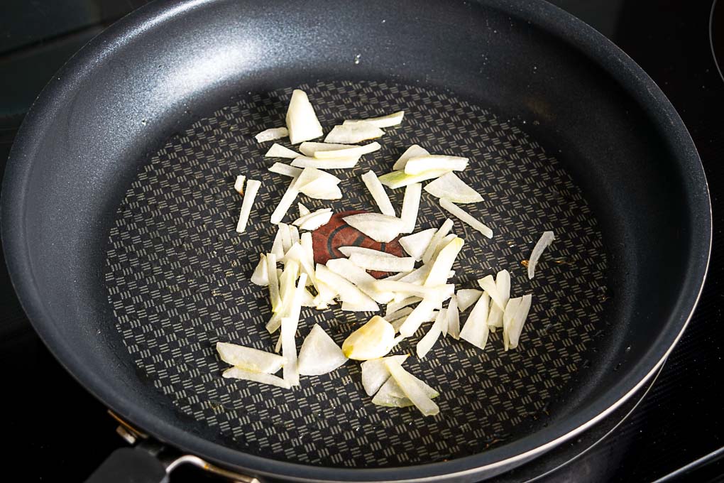 We’ll start by cooking 1/4 onion and a peeled garlic clove in a glug of oil over medium heat.