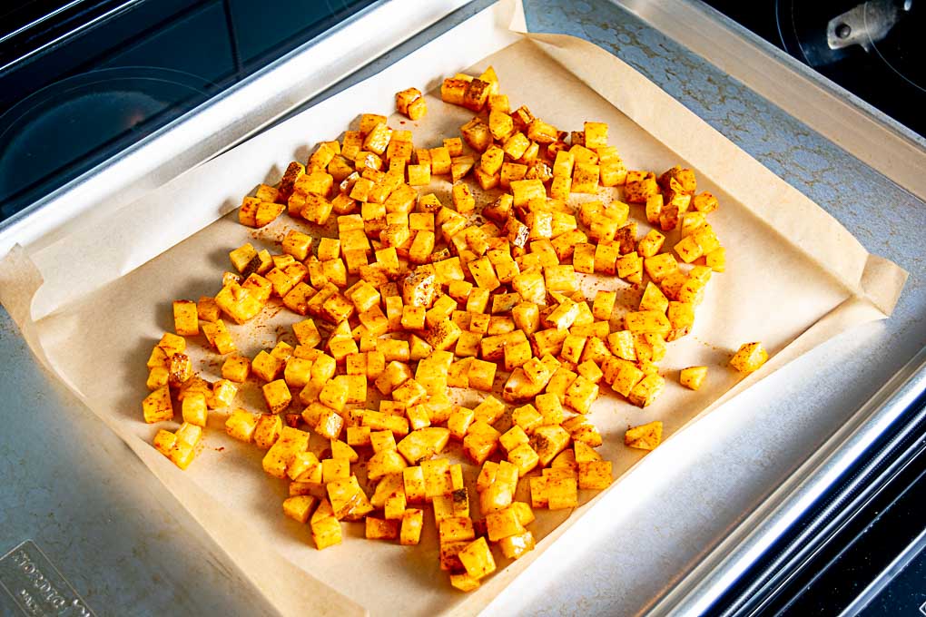 I’m still in the habit of roasting potatoes in the oven for breakfast burritos — I usually just cube the potato and toss it with chile powder, salt, pepper, and oil.