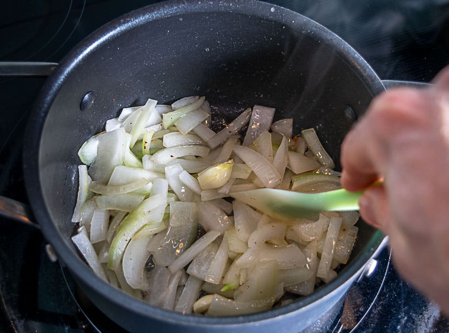 I also added a couple slices of bacon, but you can consider that optional. If you want to skip the bacon you can just cook the onion in a glug of oil.