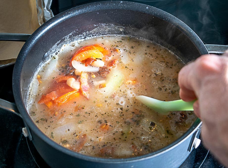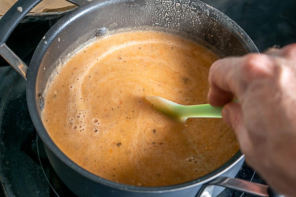 Combine well and bring this up to temp over medium heat. Note that you can reserve some of the cooked bacon pieces if you want to garnish with them.