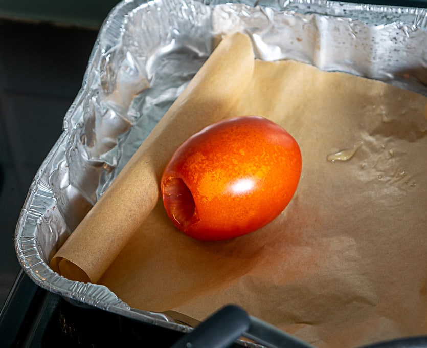 I usually start by plopping the tomatoes in the oven. I only had one for this batch but it still turned out good!