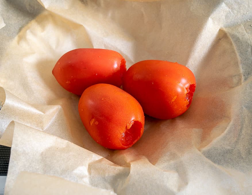 I’m also in the habit of roasting tomatoes for this recipe, so I usually put 3-4 Romas in the oven before working on the meat.