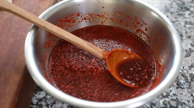 - Combine the soy sauce, water, and hot pepper flakes in a small bowl. Mix it well with a spoon.