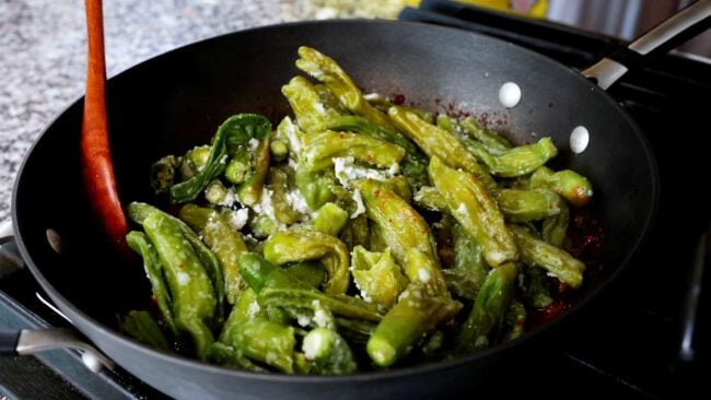- Add the steamed peppers and turn up the heat to medium high. Mix altogether with the wooden spoon for about 2 minutes until most of the broth is evaporated and the peppers are evenly coated with the sauce.