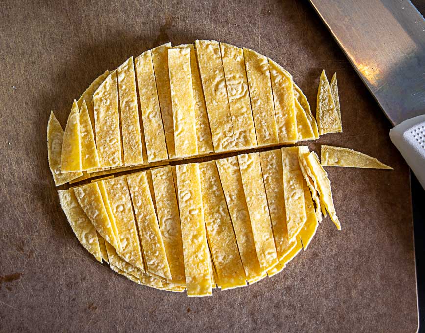 Start by chopping up 6-8 corn tortillas, depending on how big they are.