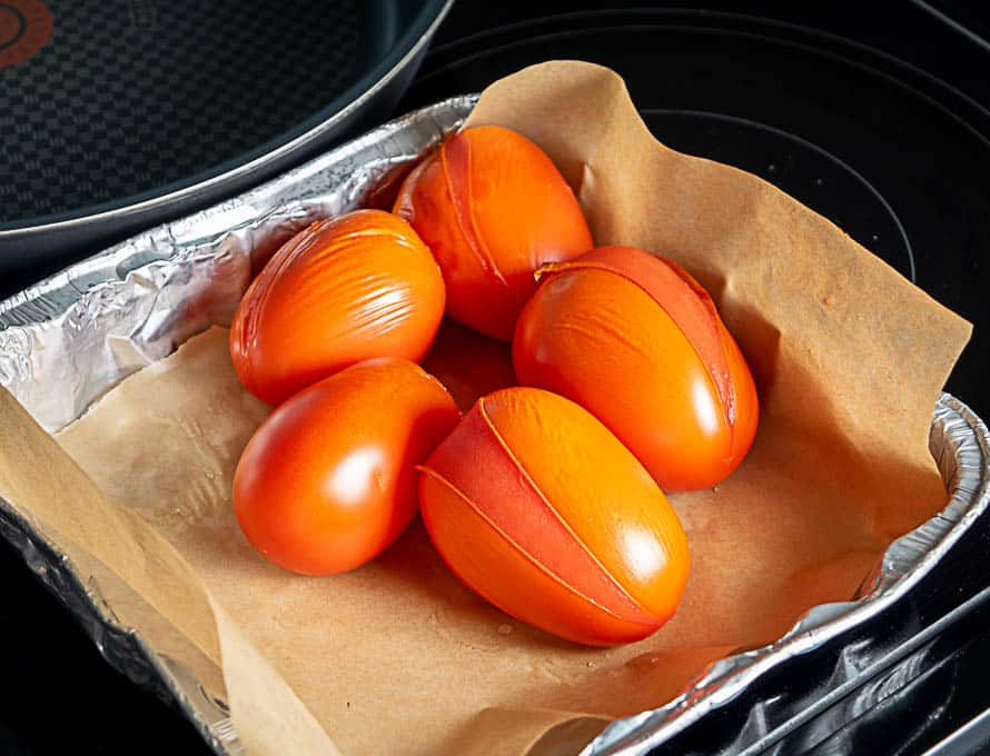 I usually start by putting the tomatoes in the oven for a bit (400F).