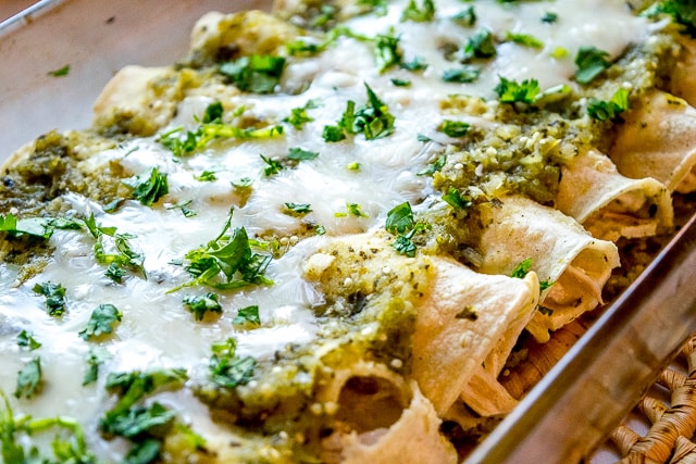 This is the other enchilada recipe that I recommend people add to their weeknight meal rotation. It’s a green sauce so it’s built using tomatillos — add some cream to the mixture and you’ll get a creamy green wonder that exists solely to drench your enchiladas 🙂
