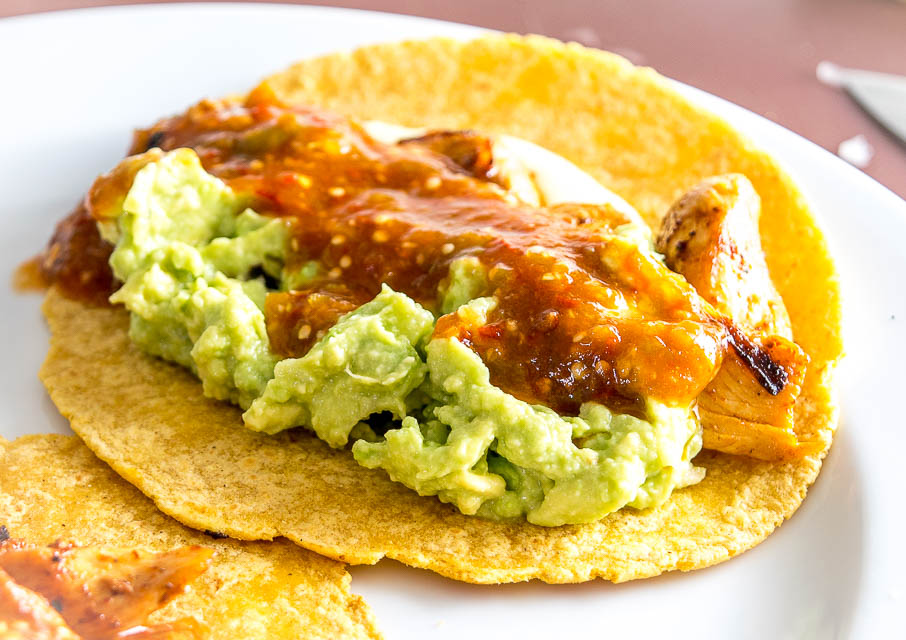 Every kitchen needs a default taco recipe and this is mine! Chicken, Guacamole, and homemade Salsa — it’s a very simple combo but when you douse the tacos in the freshly made Salsa they really come to life!