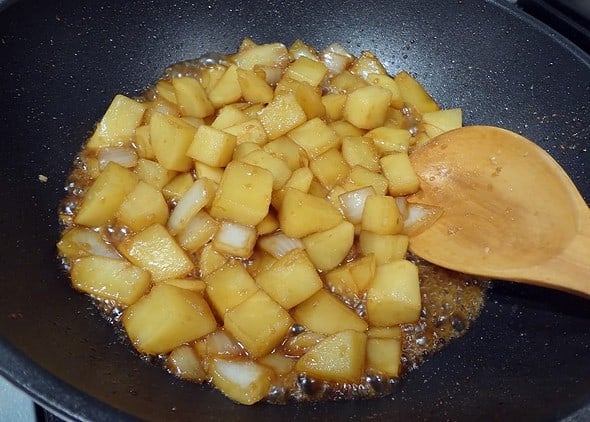 This gamja-bokkeum (stir-fried potato side dish) used to be on my regular lunch box menu. My mother sometimes added small dried anchovies and carrot, and sometimes she added ham cut into dice like potato. I used to make this all the time as my children’s lunch boxes, too.