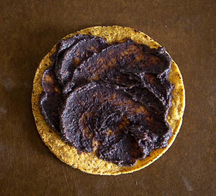 For this batch I started with home-baked tostada shells and added a thin layer of these refried beans: