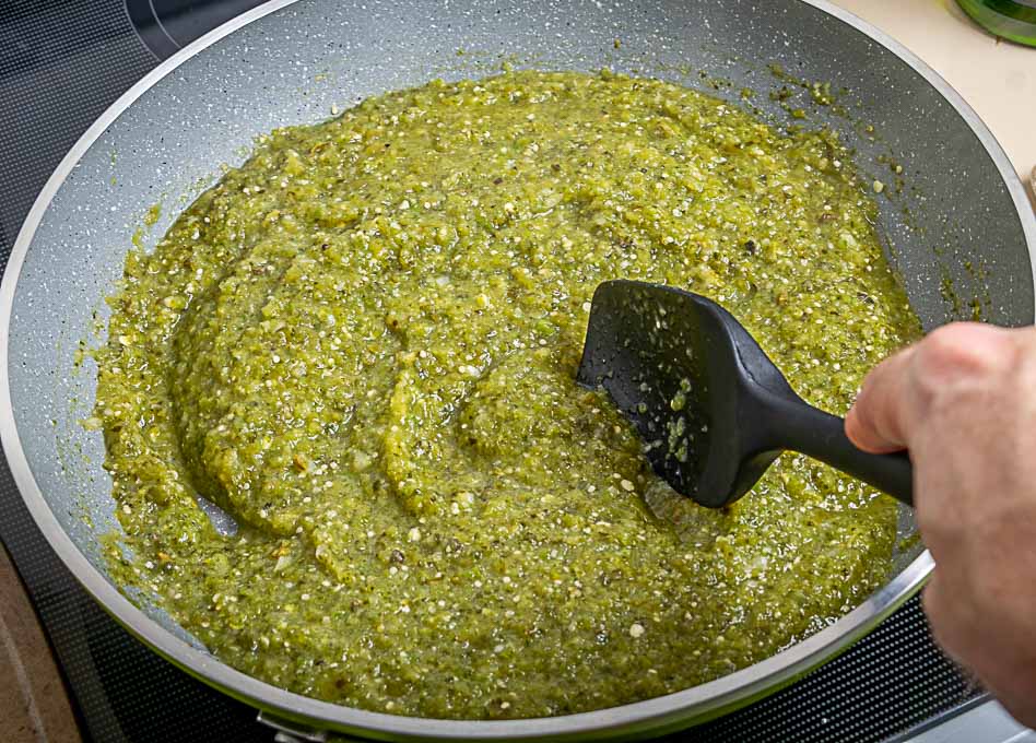 Add the shredded chicken to the Chile Verde sauce and combine well, taking a final taste for seasoning.
