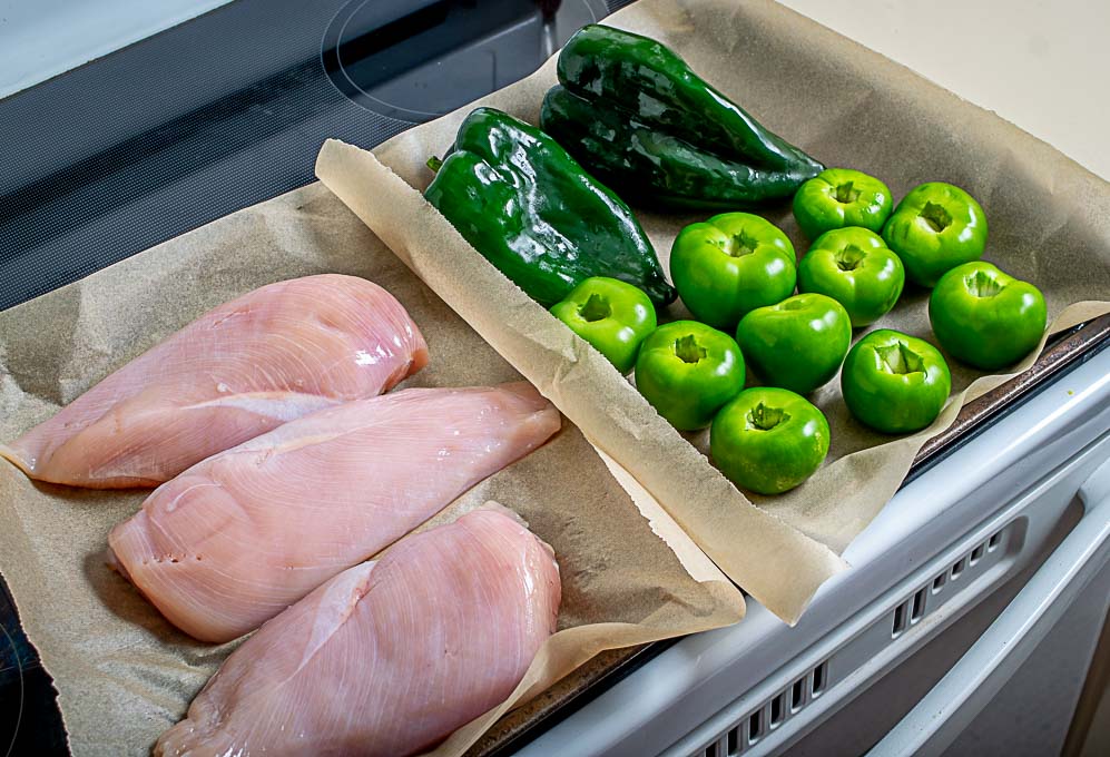 The Poblanos typically need a half hour or so to roast, so I usually pull the chicken out after about 20 minutes, and then give the Poblanos and tomatillos a few more minutes.