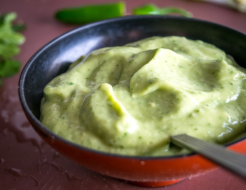 Salsa de Aguacate is a deliciously creamy green sauce that makes weekly appearances in my kitchen!  It has a subtle flavor that’s typically used to complement bold, spicy meats, but lately I goop it on just about everything ๐Ÿ™‚