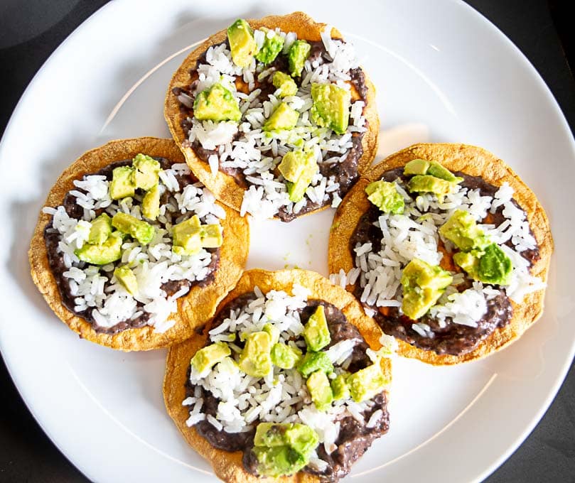 I also like to chop up avocados and toss them with a pinch of salt and a squeeze of lime.  This light seasoning turns them into the perfect Tostada topping!  Here I’m making some simple Bean and Rice Tostadas along with the seasoned avocado bits and some freshly made Salsa.  So good!