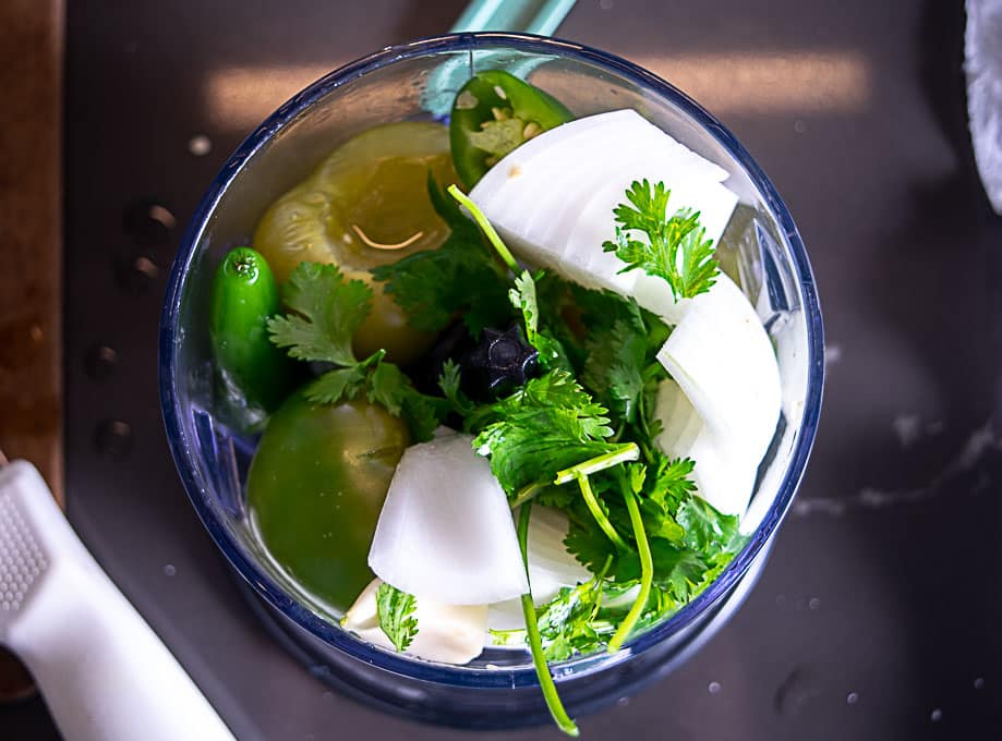 Once the tomatillos are roasted, add them to a blender or food processor along with: