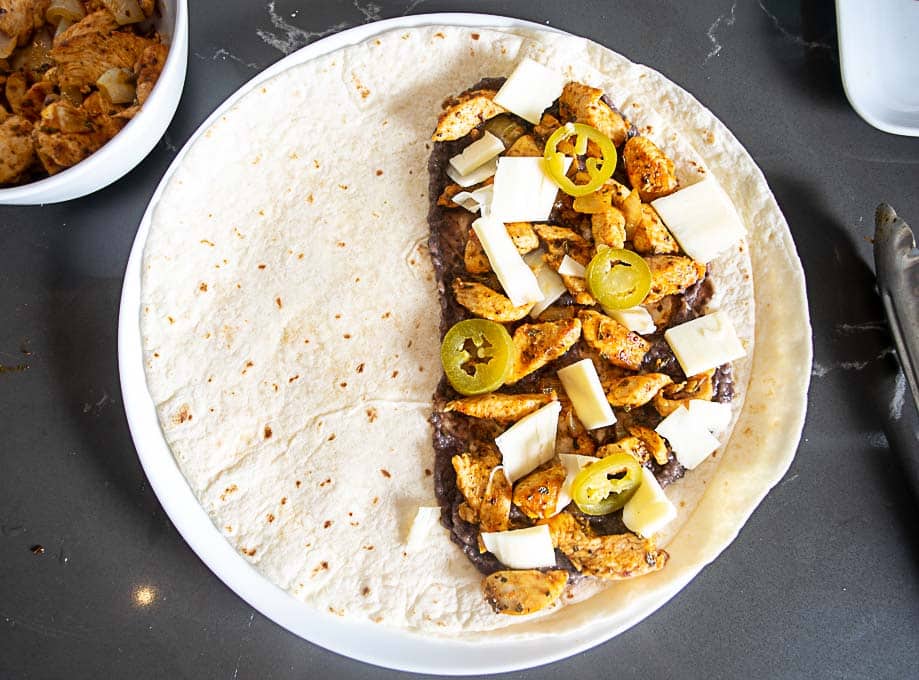 I like adding ingredients to only half of the tortilla, then folding it over.  I find it’s easiest to cook quesadillas this way, but you are welcome to load up the entire tortilla and then plop another one on top.
