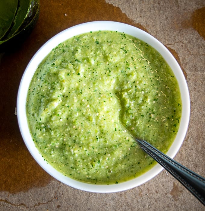 The ultra-satisfying Avocado Salsa Verde uses tomatillos as the starting point.   More info on tomatillos if you’re new to them.