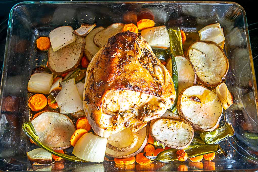 Roasting the chicken on top of the veggies will saturate them with savoriness — this is a simple technique that will bring you good eats for life!