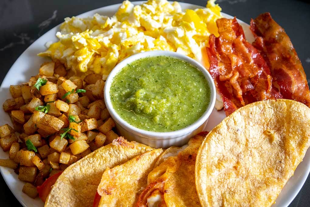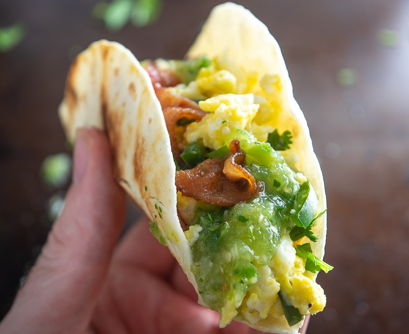 This is probably the most versatile recipe in the list. I loaded these with scrambled eggs, bacon, and some freshly made Salsa Verde, but feel free to load up your Breakfast Tacos with your favorite fixings!