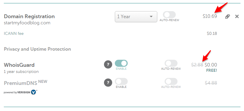 You can also consider adding privacy protection to your domain; this will keep your registration details confidential.  I think it’s worth it to do this but it’s definitely optional.  It will add a few bucks per year to your cost but it prevents spammers from being able to find out who owns your website (you!).  So on Namecheap you are looking at ~$10 bucks a year for a domain and $3 per year for the privacy protection.  It also looks like they give you the privacy protection free for the first year.