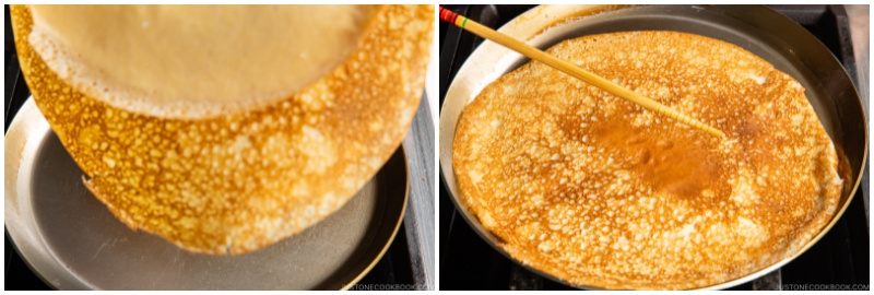 👩🏻🍳 If you use a carbon-steel crepe pan like I do, some parts of the crepe may stick to the pan. But don’t worry! With a gentle poke from the chopstick, you should be able to remove the crepe from the pan easily. Just nudge it. If you have a non-stick pan, the crepe might even slide around, allowing you to lift it with your fingertips.