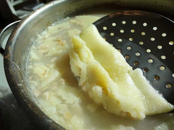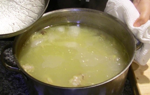 - Turn off the heat, open the lid, and pour the broth into the collecting bowl. It will be a lot whiter than the first time we poured it out.