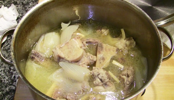 - Pour the brownish broth out of the pot and into a large bowl. We’re going to keep boiling these bones and collect the broth into this collecting bowl as we go along. Keep it in the fridge during this process.